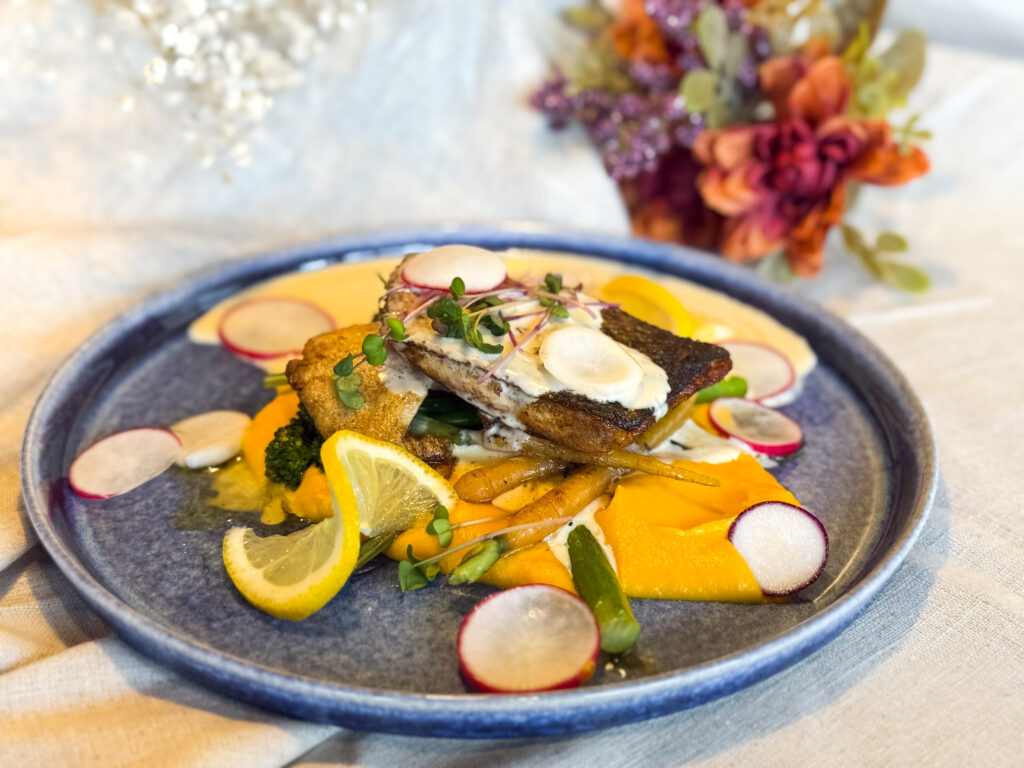 voissa paistettua taimenta ja kuhaa, porkkana-bataattipyreetä, jokirapukastiketta ja kauden kasviksia paahdettuna
