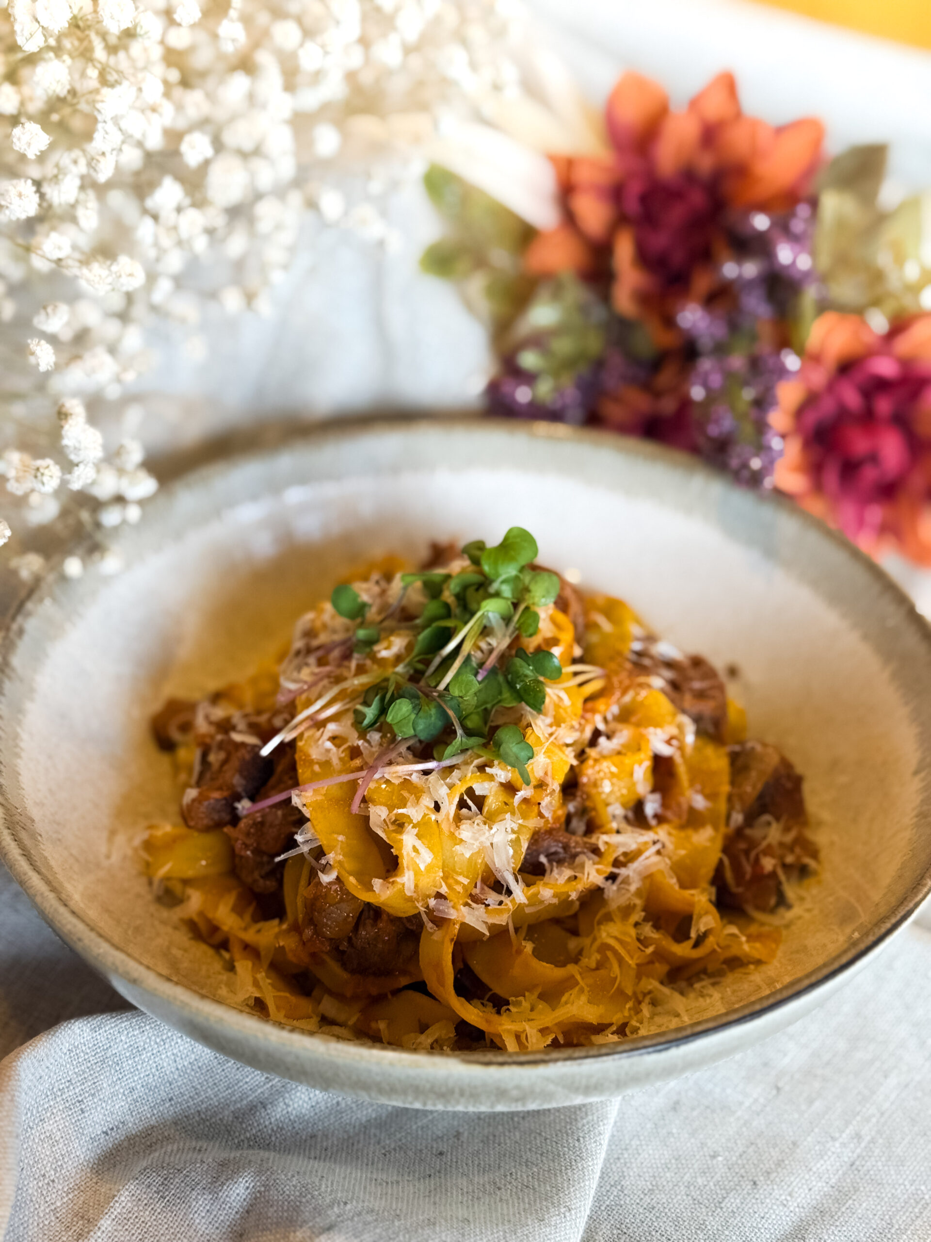 yön yli haudutettua tomaattista härkäpataa tagliatellen ja Parmesanin kera